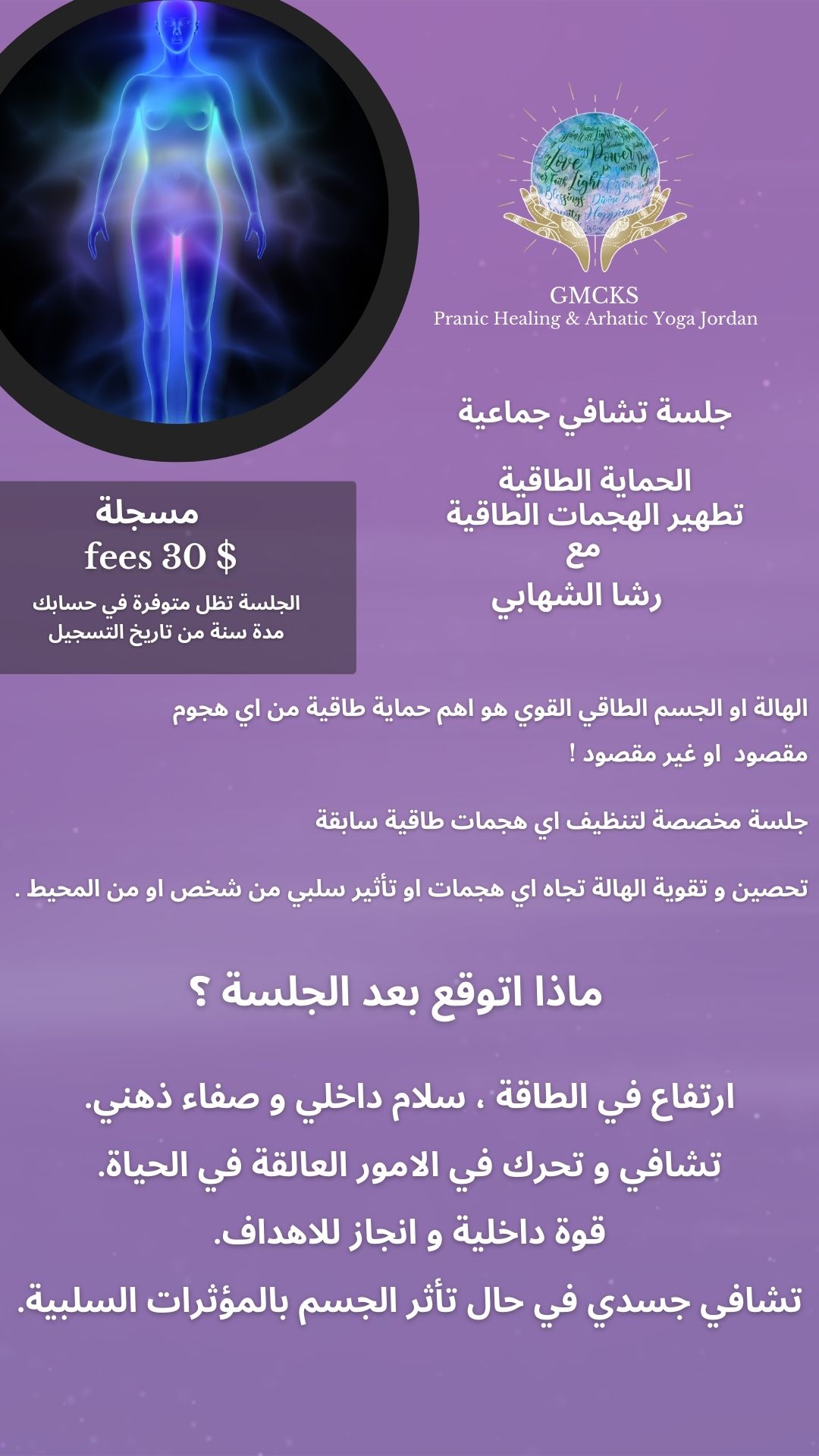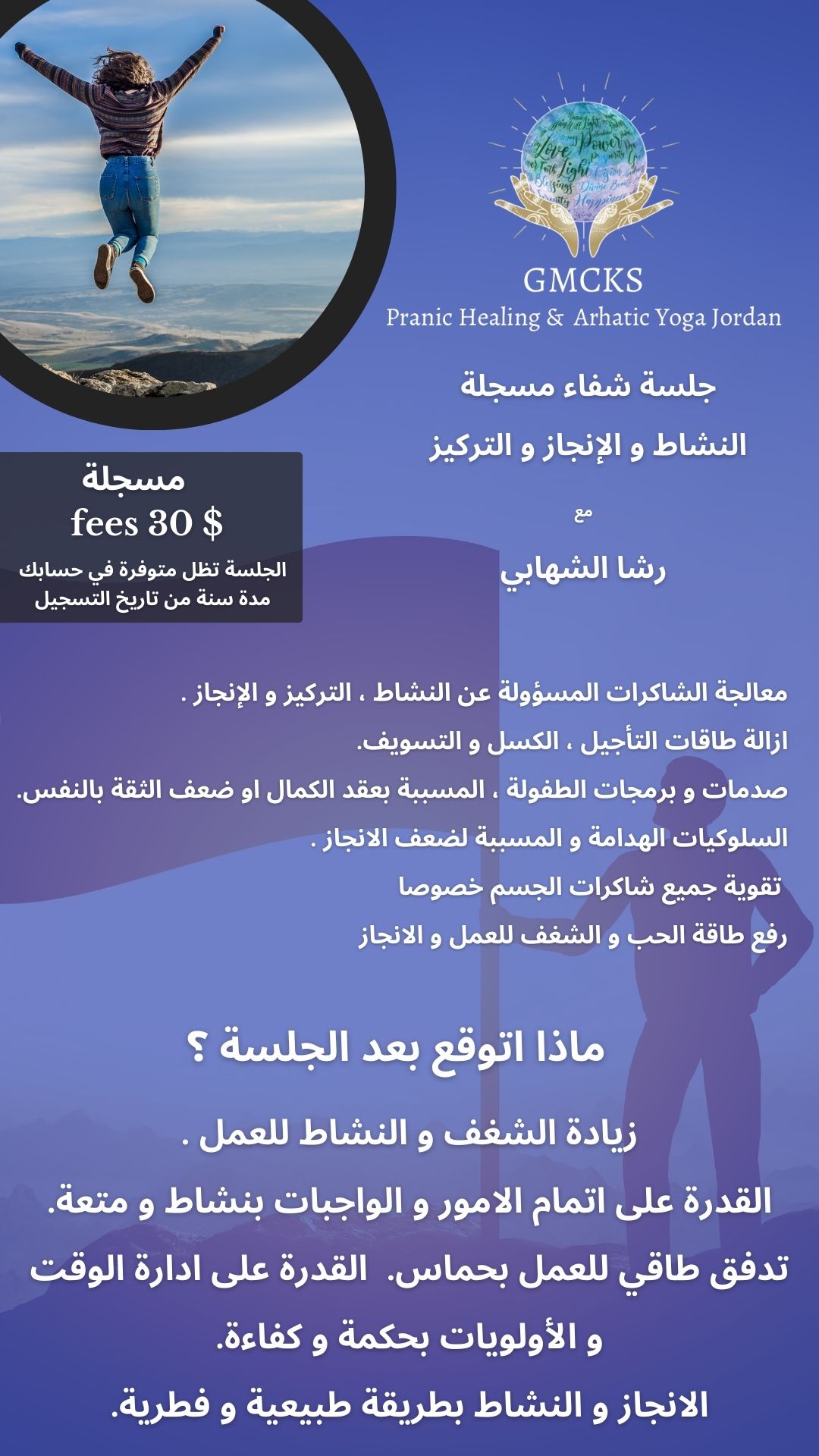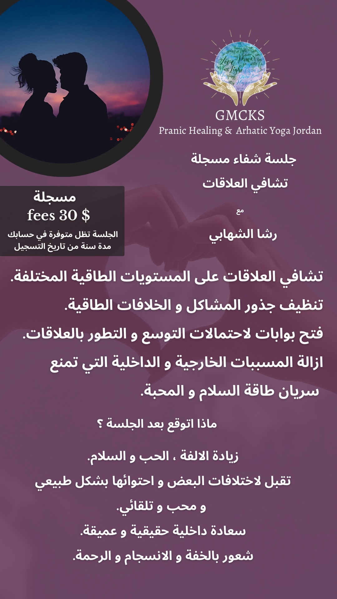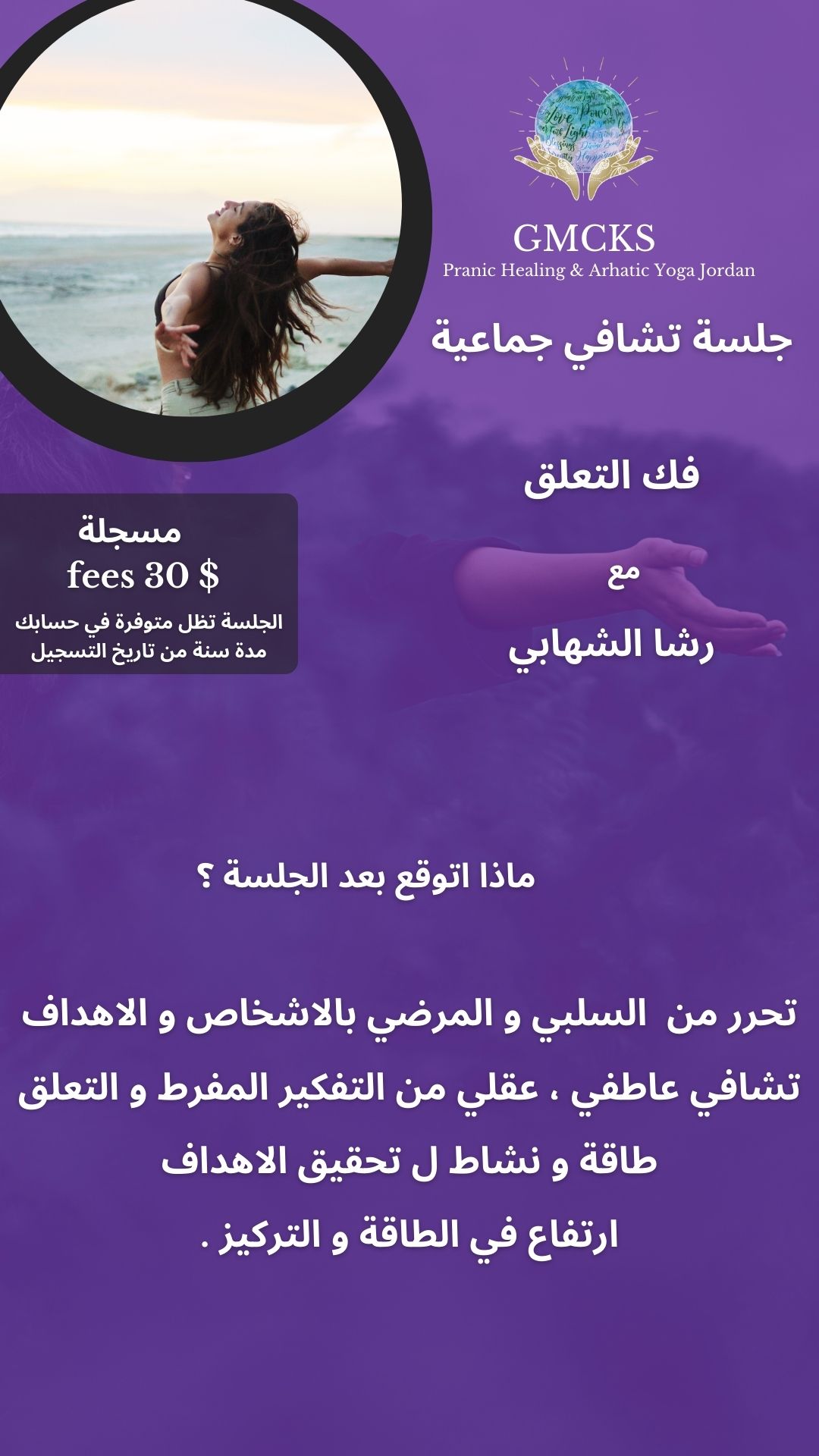 جلسة رائعة متل كل جلسات فعلا شعور بالراحة وطاقة اعلى وطمأنينة ووضوح اعلى برؤية الامور
