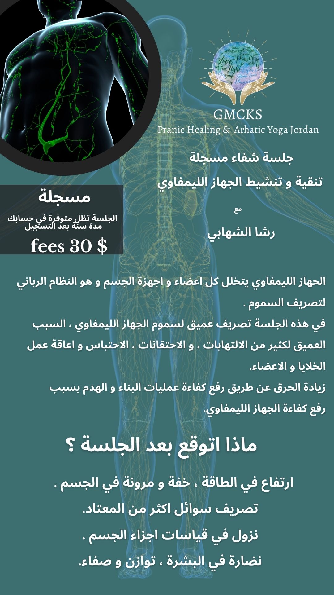 مرحبا، حابة أشارك تجربتي مع جلسة الجهاز اللمفاوي، أخذتها لتساعدني على تطهير السموم من الجسم وخسارة الوزن، والنتائج أنه راح إحتباس السوائل والنفخة، و ألم العضلات ( اي حد يمسكني اتألم) كمان راح، كان إنتفاخ في البطن مع امساك وراح الحمد لله. شكرا رشى 💕 ممتنة 🙏
