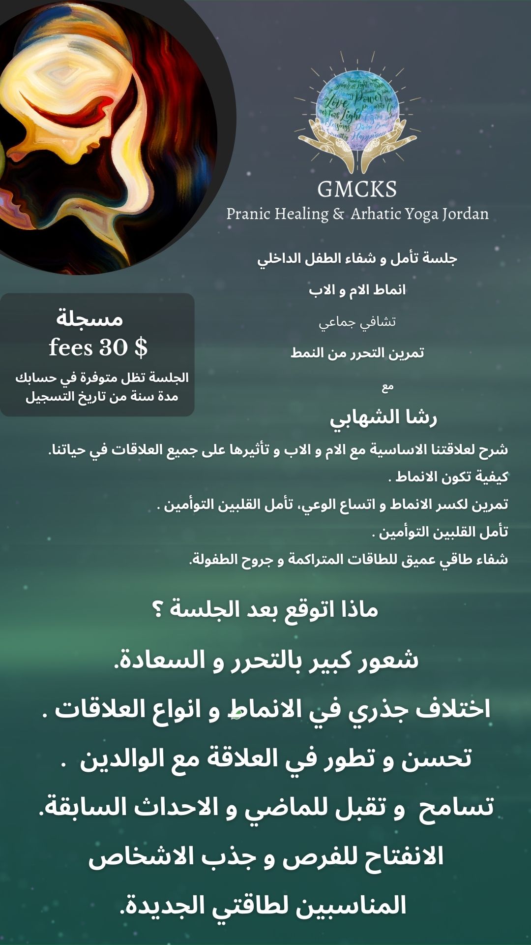 داخليا: وصلت مستوى غير مسبوق من التسليم و الطمأنينة مع هذه الجلسة. هدوء داخلي و اتصال مع الله و سريان وجدت أثره في حياتي.