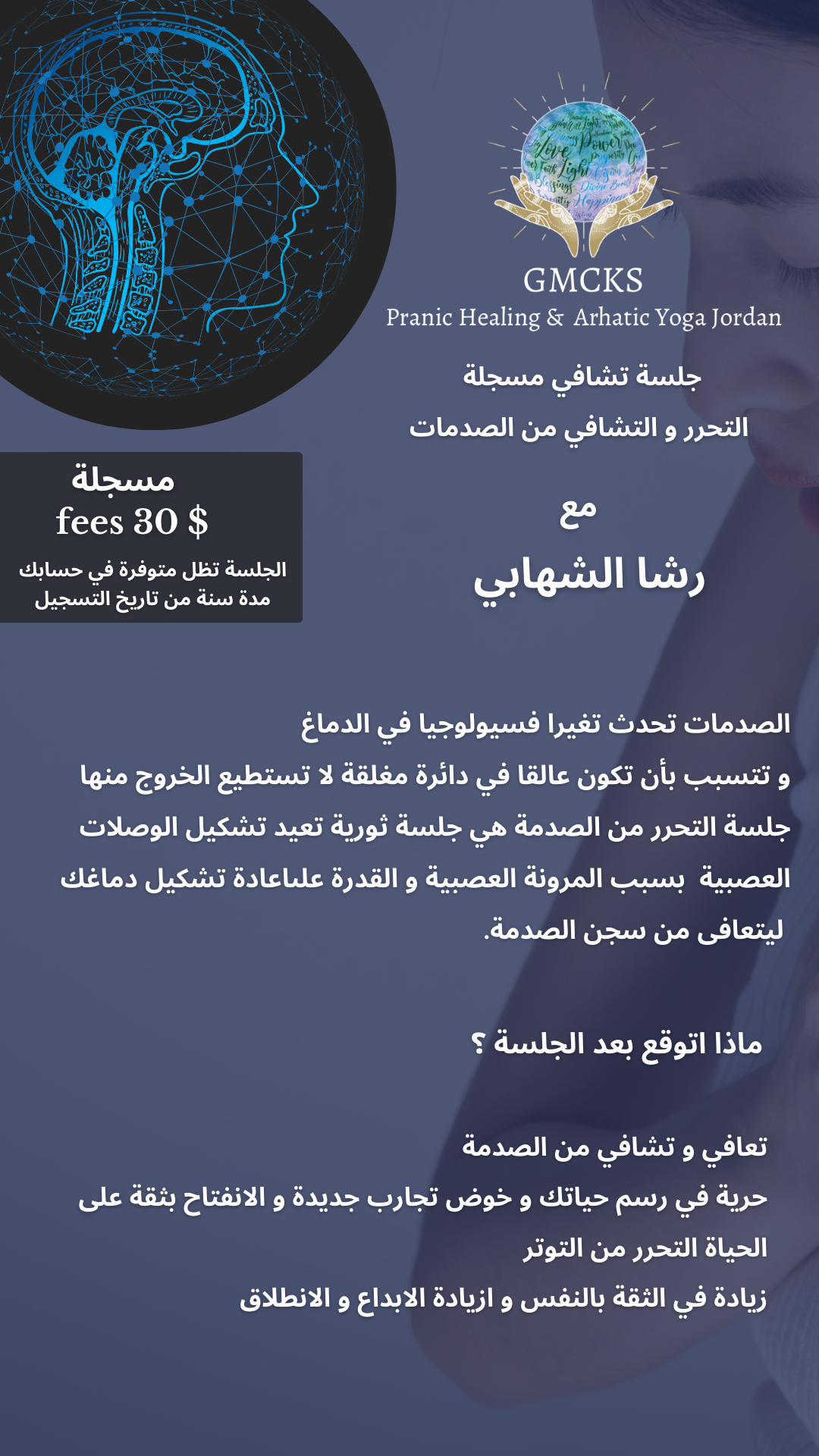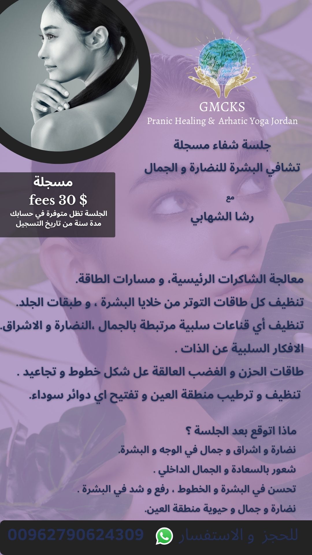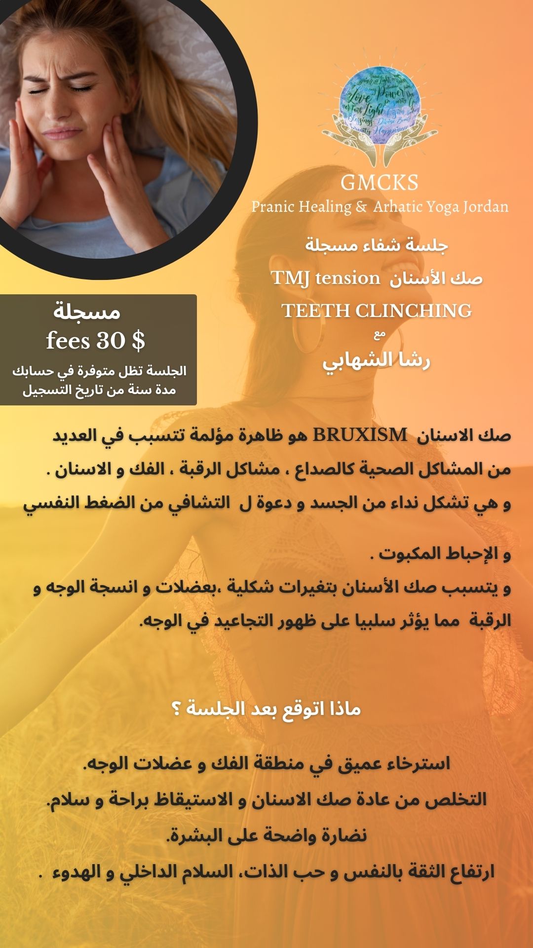 مرحبا رشا.. بدي احكيلك عن تجربة جلسة تشافي صك الأسنان، كان عندي ألم بالفك نتيجة حركة خاطئة ما كنت قادرة آكل أو أفتح تمي .. عملت الجلسة بعد ٣ ساعات بدأ التحسن.. صحيت تاني يوم زال الألم تماماً وتم الشفاء الحمدالله 🤍🍀💚 شكراً من القلب 🙏