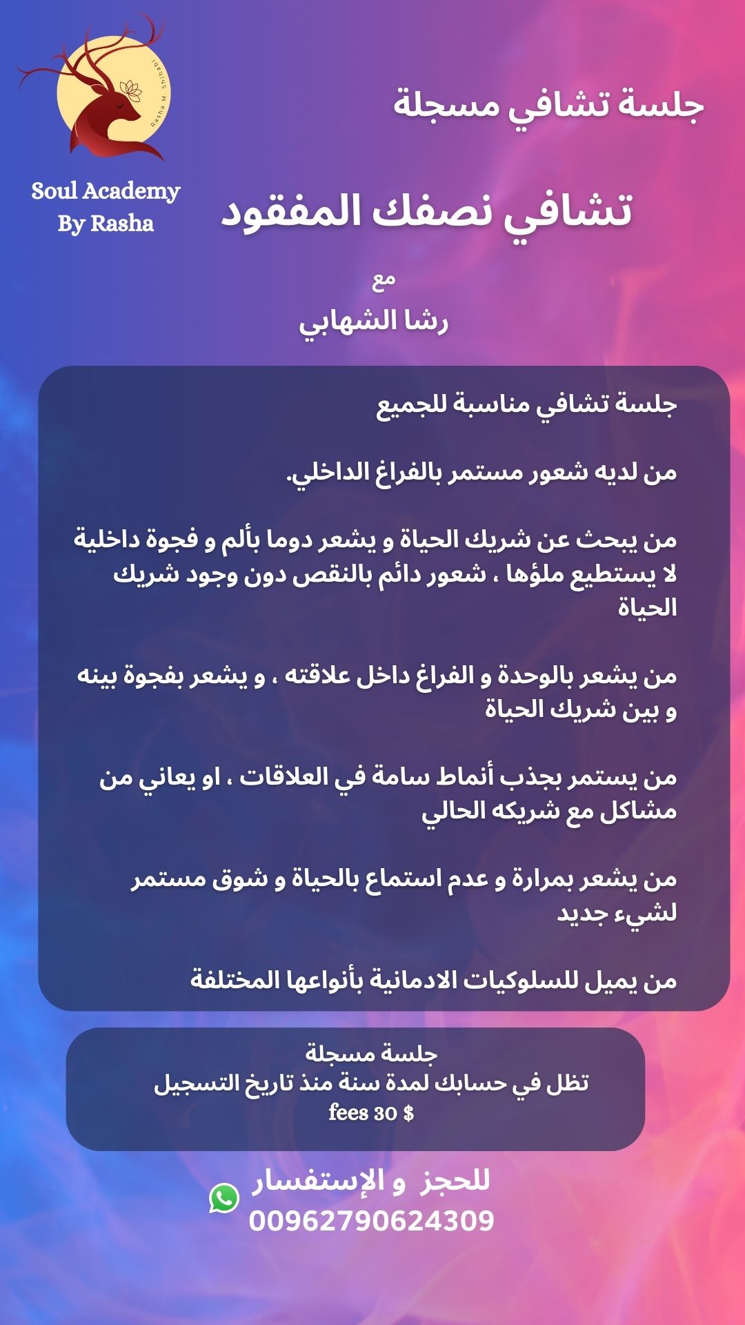 شكراً من القلب على هالجلسة إجت بالوقت المناسب، بعد الغضب والرفض يلي حملتو بداخلي لسنوات على شخص.. اليوم أول مرة بختبر شعور القبول والسلام .. حاسة بخفة ورحمة وعي جديد اكتسبتو بعد هالجلسة 🙏🌟 امتنان لوجودك رشا 🤍💖🙏 حاسة هلأ بقدر افرح وطير 💃🪂😻